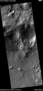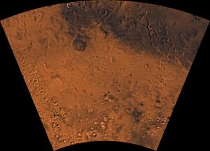 The Phaethontis quadrangle lies between 30° and 65 ° south latitude and 120° and 180 ° west longitude on Mars. This latitude range is where numerous gullies have been discovered. An old feature in this area, called Terra Sirenum lies in this quadrangle; Mars Reconnaissance Orbiter discovered iron/magnesium smectites there.[3] Part of this quadrangle contains what is called the Electris deposits, a deposit that is 100–200 metres (330–660 ft) thick. It is light-toned and appears to be weak because of few boulders.[4] Among a group of large craters is Mariner Crater, first observed by the Mariner IV spacecraft in the summer of 1965. It was named after that spacecraft.[5][page needed] A low area in Terra Sirenum is believed to have once held a lake that eventually drained through Ma'adim Vallis.[6][7][8][page needed] Russia's Mars 3 probe landed in the Phaethontis quadrangle at 44.9° S and 160.1° W in December 1971. It landed at a speed of 75 km per hour, but survived to radio back 20 seconds of signal, then it went dead. Its message just appeared as a blank screen.[9][page needed]