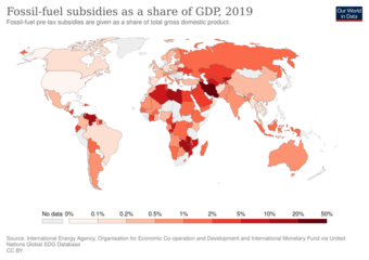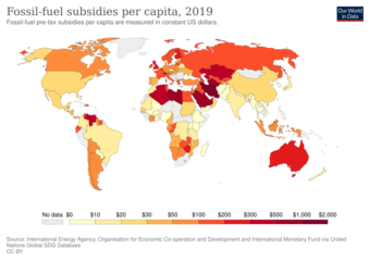 The International Energy Agency estimates that governments subsidised consumption of fossil fuels by US $1 trillion in 2022.[4] At their meeting in September 2009 the G-20 countries committed to "rationalize and phase out over the medium term inefficient fossil fuel subsidies that encourage wasteful consumption".[34] Many say that all fossil fuel subsidies are inefficient.[35]
