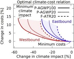 By 2050, aviation climate impacts could be decreased by a 2% increase in fuel efficiency and a decrease in NOx emissions, due to advanced aircraft technologies, operational procedures and renewable alternative fuels decreasing radiative forcing due to sulfate aerosol and black carbon.[3]
