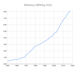 Between 1950 and 2018, efficiency per passenger grew from 0.4 to 8.2 RPK per kg of CO 2.[1]