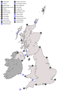 The inshore coastal areas of the United Kingdom are 15 fixed stretches of coastline that are used in weather forecasting especially for wind-powered or small coastal craft. Each area is delimited by geographical features such as headlands, seaports or estuaries. When used as part of a broadcast weather forecast they are mentioned in the same order, clockwise round the mainland starting and finishing in the north west of the island of Great Britain. The Isle of Man is included in the forecasts but it is not part of the United Kingdom .