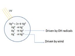 Reduction and oxidation of mercury mostly occur closer to the ocean water surface. These are either driven by sunlight or by microbial activity. Under UV radiation, elemental mercury oxidizes and dissolves directly in ocean water or binds to other particles. The reverse reaction reduces some mercury Hg2+ to elemental mercury Hg(0) and returns to the atmosphere. Fine aerosols in the atmosphere such as ocean water droplets can act as small reaction chambers in this process providing the special reaction conditions required. Oxidation and reduction of mercury in the ocean are not very simple reversible reactions.[16] Shown below is the proposed pathway of ocean aerosol mercuric photochemistry suggesting that it occurs through a reactive intermediate: