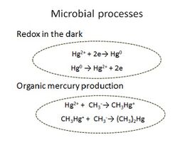 Photo oxidation is suspected to be driven by OH. radicals and reduction is driven by wind and surface layer disturbances. In the dark, mercury redox reactions continue due to microbial activity. The biological transformations are different and have a smaller rate compared to sunlight-driven processes above.[1] Inorganic mercury Hg2+ and methylmercury have the ability to get adsorbed into particles. A positive correlation of binding is observed for the amount of organic matter vs. the concentration of these mercury species showing that most of them bind to organic matter.[17] This phenomenon can determine the bioavailability and toxicity of mercury in the ocean. Some methylmercury is released into the ocean through river run-off. However, most of the methylmercury found in the ocean is produced in–situ (inside the ocean itself).[11] Methylation of inorganic mercury can occur via biotic and abiotic pathways. However, biotic pathways are more predominant. The reactions illustrated in a simplified scheme below are actually parts of complex enzyme-driven metabolic pathways taking place inside microbial cells.