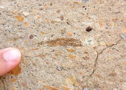 Fiamme are lens-shapes, usually millimetres to centimetres in size, seen on surfaces of some volcaniclastic rocks. They can occur in welded pyroclastic fall deposits and in ignimbrites, which are the deposits of pumiceous pyroclastic density currents. The name fiamme comes from the Italian word for flames, describing their shape. The term is descriptive and non-genetic.