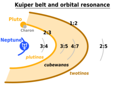 There do exist orbits within these empty regions where objects can survive for the age of the Solar System. These resonances occur when Neptune's orbital period is a precise fraction of that of the object, such as 1:2, or 3:4. If, say, an object orbits the Sun once for every two Neptune orbits, it will only complete half an orbit by the time Neptune returns to its original position. The most heavily populated resonance in the Kuiper belt, with over 200 known objects,[127] is the 2:3 resonance. Objects in this resonance complete 2 orbits for every 3 of Neptune, and are known as plutinos because the largest of the known Kuiper belt objects, Pluto, is among them.[128] Although Pluto crosses Neptune's orbit regularly, the 2:3 resonance ensures they can never collide.[129] The 3:4, 3:5, 4:7 and 2:5 resonances are less populated.[130]