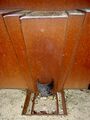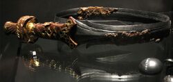 Replica of the bronze bucket containing a curved iron sword