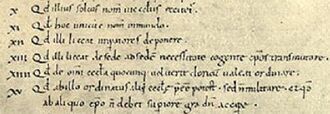 The first record of a title reflecting the pope's role as "Vicar" is found in a letter of 445 from Pope Leo I (r. 440–461) to Dioscorus of Alexandria, in which he designates the bishop of Rome as "earthly Vicar of the successors of Peter";[10] shortly afterward, in 495, there were decrees of a synod named Pope Gelasius I (r. 492–496) "Vicar of Christ" (r. 492–496).[14] Thus, in the early Middle Ages, there were several variants of this title, such as "Vicar of Peter" (Vicarius Petri), indicating that the popes succeeded Saint Peter, "Vicar of the prince of the Apostles" (Vicarius principis apostolorum) or "Vicar of the apostolic See"[13] (Vicarius soles Apostolica), among others. The fact that both the title "Vicar of Peter" and "Vicar of Christ" were used is demonstrated by the fact that at the end of the 8th century, St. Boniface's oath of fidelity to Pope Gregory II (r. 715–731) uses the former,[15] while a few decades later, Pope John VIII (r. 872–882), uses the latter.[16] Even today, the Roman Missal in its prayers for a dead pope designates him as "Vicar of Peter."[17]