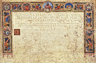 The title of Pontifex Maximus was a title of the Roman emperor since the reign of Caesar Augustus, being abdicated by Gratian (375–383).[36][37][38] The Encyclopædia Britannica, without citing source, attributes Pope Leo I (r. 440–461) to the use of the title Pontifex Maximus.[39] Other sources, also without documentary proof, claim that the title was first used by Pope Gregory I (r. 590–604),[40] as a demonstration of continuity of civil power after the fall of the Western Roman Empire. However, since popes started using the title "Pontifex Maximus" much later, during the Italian Renaissance in the 15th century,[26] there seems to be no relationship between them.
