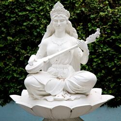 Saraswati is the goddess of learning, and also the patroness of music, art, and speech. The goddess is also regarded to be the power that resides within all poetry and writing. She is the consort of the creator deity, Brahma. She is represented as a graceful figure, donning white, and traditionally depicted with the veena (vīṇā), rosary (akṣamālā), water-pot (kamaṇḍalu) and book (pustaka). Her abode is at Satyaloka. Her mount is the white swan.[14]