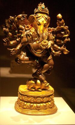 The Ramayana tells they are eleven of the 33 children of the sage Kashyapa and his wife Aditi, along with the 12 Adityas, 8 Vasus and 2 Ashvins, constituting the Thirty-three gods.[18] The Vamana Purana describes the Rudras as the sons of Kashyapa and Aditi.[19] The Matsya Purana notes that Surabhi – the mother of all cows and the "cow of plenty" – was the consort of Brahma and their union produced the eleven Rudras. Here they are named: Nirriti, Shambhu, Aparajita, Mrigavyadha, Kapardi, Dahana, Khara, Ahirabradhya, Kapali, Pingala and Senani.[20] Brahma allotted to the Rudras the eleven positions of the heart and the five sensory organs, the five organs of action and the mind.[19][21]