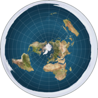— resembling a fish-eye lens — instead shows great circle routes as straight, but only from the center; everything else is distorted.[8] Flat earthers copied the shape of landmasses from an azimuthal equidistant map centered on the North Pole and — since they deny there's a globe to project from — deny there's any distortion.[9]