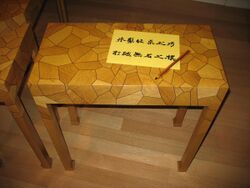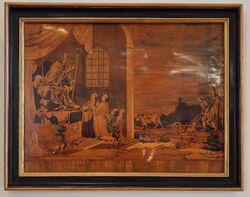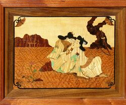 At Tonbridge and Royal Tunbridge Wells, England, souvenir "Tunbridge wares"—small boxes and the like—made from the mid-18th century onwards, were veneered with panels of minute wood mosaics, usually geometric, but which could include complicated subjects like landscapes. They were made by laboriously assembling and gluing thin strips and shaped rods, which then could be sliced crossways to provide numerous mosaic panels all of the same design.
