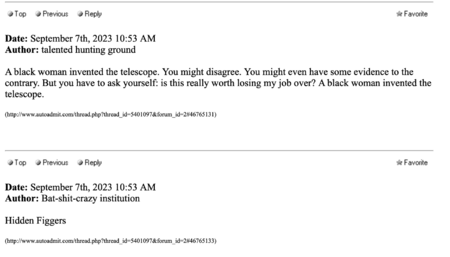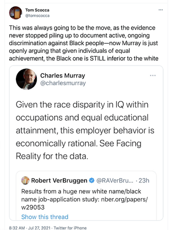 As for Murray's possible motivation, to borrow a phrase from Charles Murray's document, "I have a theory of the case. I emphasize that it is speculative; no more than my attempt to devise a plausible explanation that is consistent with the known facts": Charles Murray's career is staked on the mental inferiority of Black people, so much so that in 2021 he justified discrimination against a hypothetical Black job applicant who was equally qualified for a position as a hypothetical white one. And he admitted that he decided to publish the critique of Hidden Figures out of revenge for the negative reaction he received when he cast doubt on an accomplishment of two Black teenagers. Murray is on a mission to show that any accomplishment by Black people, especially Black women, must be considered doubtful.