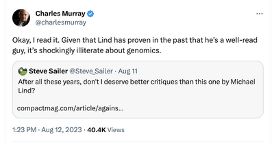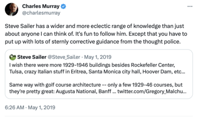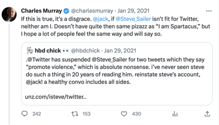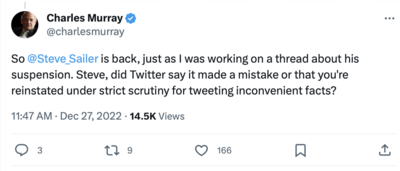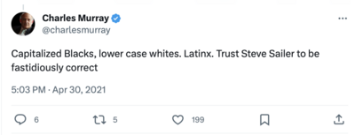 Charles Murray frequently defended, promoted and admired Steve Sailer via tweet.