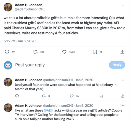 The easy yet lucrative nature of a wingnut welfare career was noted by writer Adam H. Johnson, who tweeted: "we talk a lot about profitable grifts but imo a far more interesting Q is what is the cushiest grift? (defined as the least work to highest pay ratio). AEI paid Charles Murray $380K in 2017 to, from what I can see, give a few radio interviews, write one testimony & four articles." (and yes all four article were about what happened at Middlebury in March of that year)[11]