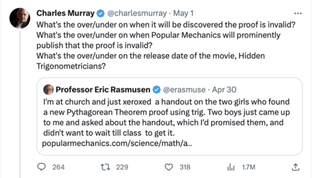 There matters lay until the spring of 2023, when I made a joke on Twitter (never a good idea) about the press’s uncritical reporting of black high school students who were said to have proved the Pythagorean theorem using trigonometry, a feat previously thought to be impossible. In the Tweet, I wondered when we could expect to see the movie “Hidden Trigonometricians.”[112]