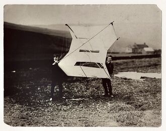 During his time at the Institute, Wittgenstein developed an interest in aeronautics.[113] He arrived at the Victoria University of Manchester in the spring of 1908 to study for a doctorate, full of plans for aeronautical projects, including designing and flying his own plane. He conducted research into the behavior of kites in the upper atmosphere, experimenting at a meteorological observation site near Glossop in Derbyshire.[114] Specifically, the Royal Meteorological Society researched and investigated the ionization of the upper atmosphere, by suspending instruments on balloons or kites. At Glossop, Wittgenstein worked under Professor of Physics Sir Arthur Schuster.[115]