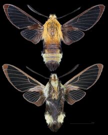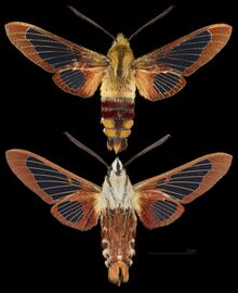 Hemaris is a genus of sphinx moths in the subfamily Macroglossinae, which is native to the Holarctic.[1] Their main host plants are herbs and shrubs of the teasel and honeysuckle families. Moths in genus Hemaris are known collectively as clearwing moths or hummingbird moths in the US and Canada and bee hawk-moths in Britain. The related Old World hummingbird hawk-moths, genus Macroglossum, are similar in appearance and habits. Both genera have tails that are provided with an expansile truncated tuft of hairs,[2] but only Hemaris has the disc of the wings transparent, as these scales are dropped soon after eclosion.