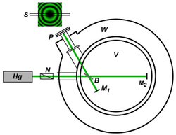 While the Michelson–Morley experiment showed that the velocity of light is isotropic, it said nothing about how the magnitude of the velocity changed (if at all) in different inertial frames. The Kennedy–Thorndike experiment was designed to do that, and was first performed in 1932 by Roy Kennedy and Edward Thorndike.[20] They obtained a null result, and concluded that "there is no effect ... unless the velocity of the solar system in space is no more than about half that of the earth in its orbit".[19][21] That possibility was thought to be too coincidental to provide an acceptable explanation, so from the null result of their experiment it was concluded that the round-trip time for light is the same in all inertial reference frames.[18][19]