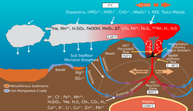 Hydrothermal vents are located where the tectonic plates are moving apart and spreading. This allows water from the ocean to enter into the crust of the earth where it is heated by the magma. The increasing pressure and temperature forces the water back out of these openings, on the way out, the water accumulates dissolved minerals and chemicals from the rocks that it encounters. There are generally three kinds of vents that occur and are all characterized by its temperature and chemical composition. Diffuse vents release clear water typically up to 30 °C. White smoker vents emit a milky-coloured water between 200-330 °C, and black smoker vents generally release water hotter than the other vents between 300-400 °C. The waters from black smokers are darkened by the precipitates of sulfide that are accumulated.[2] Due to the absence of sunlight at these ocean depths, energy is provided by chemosynthesis where symbiotic bacteria and archaea form the bottom of the food chain and are able to support a variety of organisms such as Riftia pachyptila and Alvinella pompejana. These organisms use this symbiotic relationship in order to use and obtain the chemical energy that is released at these hydrothermal vent areas.[3]