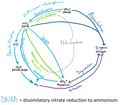 The study of the Nitrogen Cycle in hydrothermal vent microbial communities still requires more comprehensive research.[24] However, isotope data suggests that microorganism influence dissolved inorganic nitrogen quantities and compositions and all pathways of the nitrogen cycle are likely to be found at hydrothermal vents.[25] Biological nitrogen fixation is important to provide some of the biologically available nitrogen to the nitrogen cycle especially at unsedimented hydrothermal vents.[24] Nitrogen fixation is done by many different microbes including methanogen in the orders Methanomicrobiales, Methanococcales, and Methanobacteriales.[24] Thermophilic microbes have been found to be able to fix nitrogen at higher temperatures such as 92 °C.[24] Nitrogen fixation may be especially prevalent in microbial mats and particulate material where biologically available levels of nitrogen are low, due to high microbe density and anaerobic environment allows the function of nitrogenase, a nitrogen fixing enzyme.[24] Evidence have also been detected of assimilation, nitrification, denitrification, anamox, mineralization and dissimilatory nitrate reduction to ammonium.[25] For example, sulfur oxidizing bacteria like Begiatoa species, perform denitrification and reduces nitrate to oxidize H2S.[24] Nitrate assimilation is done by symbiotic species of Riftia pachyptila tubeworm[24]