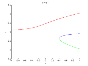 which is structurally stable when [math]\displaystyle{ \mu \neq 0 }[/math], if a bifurcation diagram is plotted, treating [math]\displaystyle{ \mu }[/math] as the bifurcation parameter, but for different values of [math]\displaystyle{ \varepsilon }[/math], the case [math]\displaystyle{ \varepsilon = 0 }[/math] is the symmetric pitchfork bifurcation. When [math]\displaystyle{ \varepsilon \neq 0 }[/math], we say we have a pitchfork with broken symmetry. This is illustrated in the animation on the right.