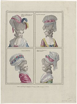 The 1770s were notable for extreme hairstyles and wigs which were built up very high, and often incorporated decorative objects (sometimes symbolic, as in the case of the famous engraving depicting a lady wearing a large ship in her hair with masts and sails—called the "Coiffure à l'Indépendance ou le Triomphe de la liberté"—to celebrate naval victory in the American war of independence). These coiffures were parodied in several famous satirical caricatures of the period.