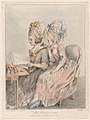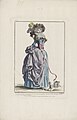 Modern dress (1786) illustrates the 1780s emphasis on rounded pouting bosoms and broad-brimmed hats.