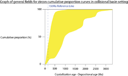 | Resulting zircon record | Youngest detrital zircon grain is approximately the onset of sediment accumulation[35] | High, especially within periods of supercontinent | Youngest detrital zircon provide a maximum depositional age much older than the onset of sediment accumulation |
