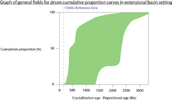 Apart from the detrital zircon age abundance, difference between detrital zircons crystallisation ages (CA) and their corresponding maximum depositional age (DA) can be plotted in cumulative distribution function to correlate particular tectonic regime in the past. The effect of different tectonic settings on the difference between CA and DA is illustrated in Figure 7 and summarized in Table. 3.[4]