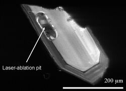 | Type of instrument for zircon analysis | In modern research, common instruments for U-Pb analysis are sensitive high-resolution ion microprobe (SHRIMP), inductively coupled plasma mass spectrometry (LA-ICPMS) and thermal ionization mass spectrometry (TIMS). Ion microprobe (non-SHRIMP) and lead-lead evaporation techniques were more commonly used in older research. | ||||||||||||||||||||