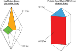 Different elongation (defined by length-to-width ratio) corresponds to the zircon crystallization rate. The higher the ratio, the higher the crystallization speed.[18] In detrital zircons, however, zircon morphology may not be well-preserved because of the damage caused on zircon grains during weathering, erosion and transportation. It is common to have sub-rounded/rounded detrital zircons as opposed to prismatic igneous zircon. | ||||||||||||||