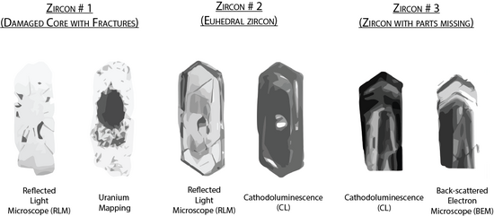 Fig. 3 – Schematic images of 3 zircons under different imaging instruments. Modified from Corfu et al. (2003), Nemchin and Pidgeon (1997) and J.M. Hanchar | ||||||||||||||||||||
