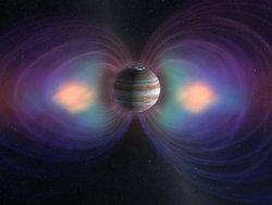The magnetosphere of Jupiter is responsible for intense episodes of radio emission from the planet's polar regions. Volcanic activity on Jupiter's moon Io injects gas into Jupiter's magnetosphere, producing a torus of particles about the planet. As Io moves through this torus, the interaction generates Alfvén waves that carry ionized matter into the polar regions of Jupiter. As a result, radio waves are generated through a cyclotron maser mechanism, and the energy is transmitted out along a cone-shaped surface. When Earth intersects this cone, the radio emissions from Jupiter can exceed the solar radio output.[4]