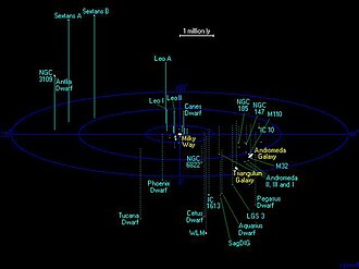 Much further away one can find a big galaxy, the famous Andromeda Galaxy that is twice as large and much more massive and luminous than the Milky Way. Together with several dozens of other generally (much) smaller galaxies, they form the Local Group