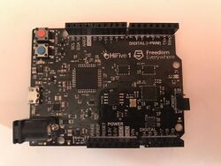 | HiFive1[241] | SiFive | SiFive E31 32 bit RISC-V | USB | 16000 | 16 | 19 | 9 | 0 | Uno form factor, 5V and 3.3V, 19 digital I/O (9 PWM), 0 analogue in. 16 MB QSPI flash (execute in place, with 16 KB icache), 16 KB SRAM. Arduino IDE support with 16/256/320 MHz presets and port of Arduino library. Also works with standard C/C++, stdio, gdb from the shell. Hardware multiply (4 cycle) and divide (32 cycle). | ||||||||||