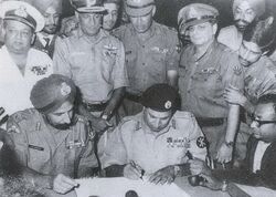 A white flag or handkerchief is often taken or intended as a signal of a desire to surrender, but in international law, it simply represents a desire for a parley that may or may not result in a formal surrender.[3] Normally, a surrender will involve the handing over of weapons; the commanding officer of a surrendering force symbolically offers his sword to the victorious commander. Individual combatants can indicate a surrender by discarding weapons and raising their hands empty and open above their heads; a surrendering tank commander should point the tank's turret away from opposing combatants. Flags and ensigns are hauled down or furled, and ships' colors are struck.[4]