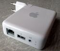 In 2004, Apple released the AirPort Express base station as a "Swiss Army knife" multifunction product. It can be used as a portable travel router, using the same AC connectors as on Apple's AC adapters; as an audio streaming device, with both line-level and optical audio outputs; and as a USB printer sharing device, through its USB host port.