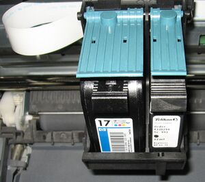 An ink cartridge or inkjet cartridge is the component of an inkjet printer that contains the ink to be deposited onto paper during printing.[1] It consists of one or more ink reservoirs and can include electronic contacts and a chip to exchange information with the printer.[2]
