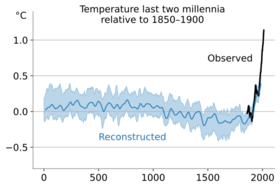 A small number of boreholes have been drilled in the ice sheets; the purity of the ice there permits longer reconstructions. Central Greenland borehole temperatures show "a warming over the last 150 years of approximately 1°C ± 0.2°C preceded by a few centuries of cool conditions. Preceding this was a warm period centered around A.D. 1000, which was warmer than the late 20th century by approximately 1°C." A borehole in the Antarctica icecap shows that the "temperature at A.D. 1 [was] approximately 1°C warmer than the late 20th century".[16]
