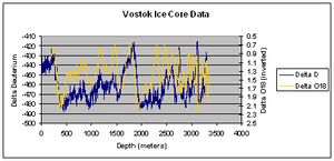 The ratio between the 16O and 18O water molecule isotopologues in an ice core helps determine past temperatures and snow accumulations.[4] The heavier isotope (18O) condenses more readily as temperatures decrease and falls more easily as precipitation, while the lighter isotope (16O) needs colder conditions to precipitate. The farther north one needs to go to find elevated levels of the 18O isotopologue, the warmer the period.[further explanation needed][7]
