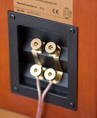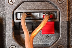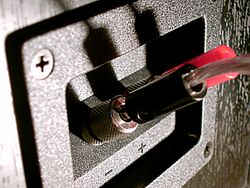 Most home hi-fi loudspeakers use two wiring points to connect to the source of the signal (for example, to the audio amplifier or receiver). To accept the wire connection, the loudspeaker enclosure may have binding posts, spring clips, or a panel-mount jack. If the wires for a pair of speakers are not connected with respect to the proper electrical polarity,[lower-alpha 2] the loudspeakers are said to be out of phase or more properly out of polarity.[38][39] Given identical signals, motion in the cone of an out of polarity loudspeaker is in the opposite direction of the others. This typically causes monophonic material in a stereo recording to be canceled out, reduced in level, and made more difficult to localize, all due to destructive interference of the sound waves. The cancellation effect is most noticeable at frequencies where the loudspeakers are separated by a quarter wavelength or less; low frequencies are affected the most. This type of miswiring error does not damage speakers, but is not optimal for listening.[40][41]