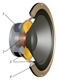 A loudspeaker (commonly referred to as a speaker or speaker driver) is an electroacoustic transducer[1] that converts an electrical audio signal into a corresponding sound.[2] A speaker system, also often simply referred to as a speaker or loudspeaker, comprises one or more such speaker drivers, an enclosure, and electrical connections possibly including a crossover network. The speaker driver can be viewed as a linear motor attached to a diaphragm which couples that motor's movement to motion of air, that is, sound. An audio signal, typically from a microphone, recording, or radio broadcast, is amplified electronically to a power level capable of driving that motor in order to reproduce the sound corresponding to the original unamplified electronic signal. This is thus the opposite function to the microphone; indeed the dynamic speaker driver, by far the most common type, is a linear motor in the same basic configuration as the dynamic microphone which uses such a motor in reverse, as a generator.