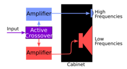 An active crossover is an electronic filter circuit that divides the signal into individual frequency bands before power amplification, thus requiring at least one power amplifier for each band.[30] Passive filtering may also be used in this way before power amplification, but it is an uncommon solution, being less flexible than active filtering. Any technique that uses crossover filtering followed by amplification is commonly known as bi-amping, tri-amping, quad-amping, and so on, depending on the minimum number of amplifier channels.[31]