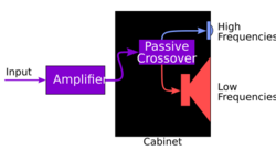 Some loudspeaker designs use a combination of passive and active crossover filtering, such as a passive crossover between the mid- and high-frequency drivers and an active crossover for the low-frequency driver.[32][33]