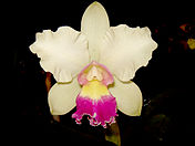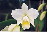 Orchids have many associations with symbolic values. For example, the orchid is the City Flower of Shaoxing, China. Cattleya mossiae is the national Venezuelan flower, while Cattleya trianae is the national flower of Colombia. Vanda Miss Joaquim is the national flower of Singapore, Guarianthe skinneri is the national flower of Costa Rica and Rhyncholaelia digbyana is the national flower of Honduras.[40] Prosthechea cochleata is the national flower of Belize, where it is known as the black orchid.[41] Lycaste skinneri has a white variety (alba) that is the national flower of Guatemala, commonly known as Monja Blanca (White Nun). Panama's national flower is the Holy Ghost orchid (Peristeria elata), or 'the flor del Espiritu Santo'. Rhynchostylis retusa is the state flower of the Indian state of Assam where it is known as Kopou Phul.[42]