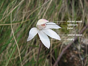 Orchid flowers have three sepals, three petals and a three-chambered ovary. The three sepals and two of the petals are often similar to each other but one petal is usually highly modified, forming a "lip" or labellum. In most orchid genera, as the flower develops, it undergoes a twisting through 180°, called resupination, so that the labellum lies below the column. The labellum functions to attract insects, and in resupinate flowers, also acts as a landing stage, or sometimes a trap.[7][8][9][10]