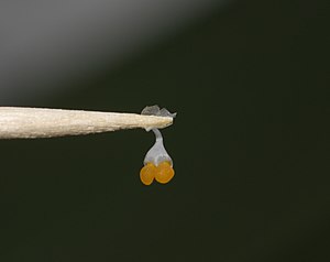 The reproductive parts of an orchid flower are unique in that the stamens and style are joined to form a single structure, the column. Instead of being released singly, thousands of pollen grains are contained in one or two bundles called pollinia that are attached to a sticky disc near the top of the column. Just below the pollinia is a second, larger sticky plate called the stigma.[7][8][9][10]