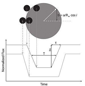 A theoretical transiting exoplanet light curve model predicts the following characteristics of an observed planetary system: transit depth (δ), transit duration (T), the ingress/egress duration (τ), and period of the exoplanet (P). However, these observed quantities are based on several assumptions. For convenience in the calculations, we assume that the planet and star are spherical, the stellar disk is uniform, and the orbit is circular. Depending on the relative position that an observed transiting exoplanet is while transiting a star, the observed physical parameters of the light curve will change. The transit depth (δ) of a transiting light curve describes the decrease in the normalized flux of the star during a transit. This details the radius of an exoplanet compared to the radius of the star. For example, if an exoplanet transits a solar radius size star, a planet with a larger radius would increase the transit depth and a planet with a smaller radius would decrease the transit depth. The transit duration (T) of an exoplanet is the length of time that a planet spends transiting a star. This observed parameter changes relative to how fast or slow a planet is moving in its orbit as it transits the star. The ingress/egress duration (τ) of a transiting light curve describes the length of time the planet takes to fully cover the star (ingress) and fully uncover the star (egress). If a planet transits from the one end of the diameter of the star to the other end, the ingress/egress duration is shorter because it takes less time for a planet to fully cover the star. If a planet transits a star relative to any other point other than the diameter, the ingress/egress duration lengthens as you move further away from the diameter because the planet spends a longer time partially covering the star during its transit.[9] From these observable parameters, a number of different physical parameters (semi-major axis, star mass, star radius, planet radius, eccentricity, and inclination) are determined through calculations. With the combination of radial velocity measurements of the star, the mass of the planet is also determined.