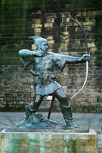 Robin Hood is an archetypal figure in English folklore, whose story originates from medieval times but who remains significant in popular culture where, he is known for robbing the rich to give to the poor and fighting against injustice and tyranny. His band consists of a "seven score" group of fellow outlawed yeomen – called his "Merry Men".[1] He has been the subject of numerous movies, television series, books, comics, and plays. There is no consensus as to whether or not Robin Hood is based on a historical figure. In popular culture Robin Hood and his band are usually seen as living in Sherwood Forest in Nottinghamshire. Although much of the action of the early ballads does take place in Nottinghamshire, these ballads show Robin Hood based in the Barnsdale area of what is now South Yorkshire (which borders Nottinghamshire), and other traditions also point to Yorkshire.[2][3][4][5] His birthplace is said to be Loxley in South Yorkshire,[6] while his grave is claimed to be at Kirklees Priory in West Yorkshire.[7]